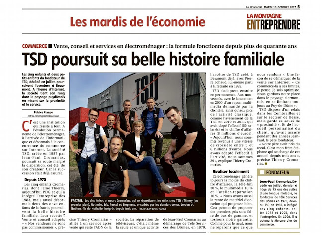 Un excellent vendeur d'électroménager indépendant. Choix réduit mais de très bonne qualité (3 exemples : téléviseur Panasonic; imprimante uniquement un modèle Hewlett Packard il y a un peu plus d'un an ; congélateur armoire no frost uniquement Bosch et Liebherr aujourd'hui. Ne faites pas la même erreur que moi. J'ai acheté il y a 2 ans 2 mois un congélateur no frost Whirlpool qui vient de tomber en panne, garantie expirée de 2 mois chez cDiscount. Bilan : SAV inexistant chez cDiscount que je connaissais mais également chez Whirlpool. Je réside à Orcival. Chez TSD livraison et installation gratuite du Liebherr demain commandé ce matin, débarras du Whirlpool, et paiement en 4 fois sans frais. Je recommande vivement TSD qui ne m'a jamais déçu au fils des ans et saura, j'en suis sûr, vous dépanner rapidement en cas de pépin ce qui ne sera pas le cas de toute autre enseigne clermontoise (Darty, Boulanger ou autres) qui vendent n'importe quoi.